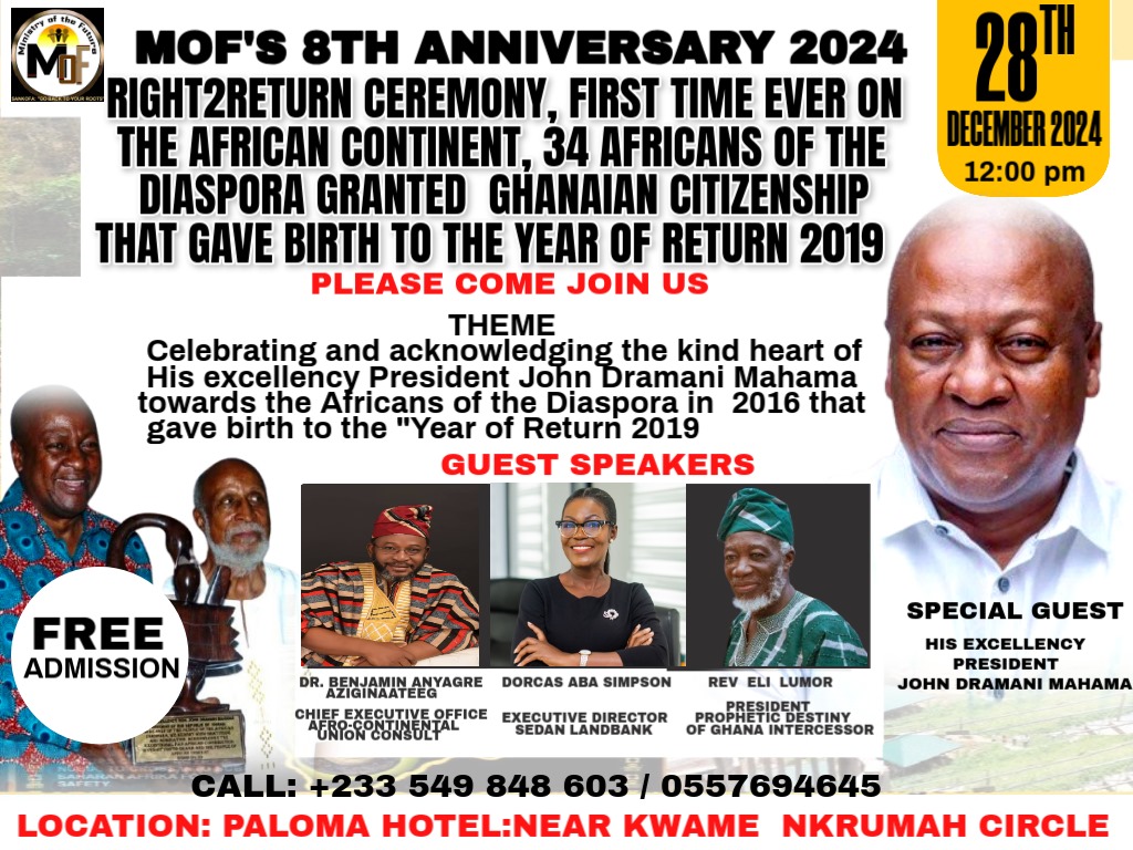 The ministry of the future (MOF) led by Dr.Maulana Maulana has confirmed Saturday 28th December 2024 as the official date for the 8th Anniversary of the first time on the African continent granting Ghanaian citizenship to Africans of the diaspora in 2016.