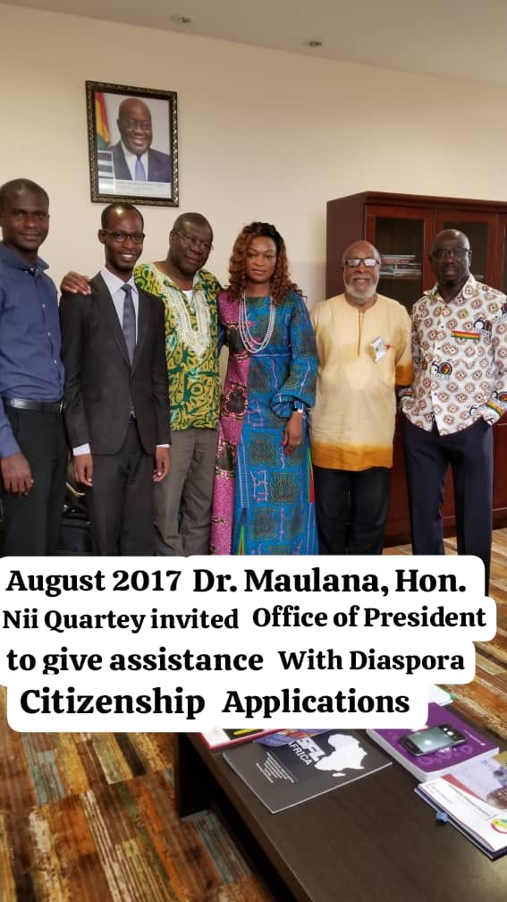 On December 28, 2016, the Ghana Citizenship Grant for African Diaspora led by Dr. Maulana Maulana’s and Hon. Nii Kwesi Quartey, then Executive Secretary to former President John Dramani Mahama pushed for the grant.
